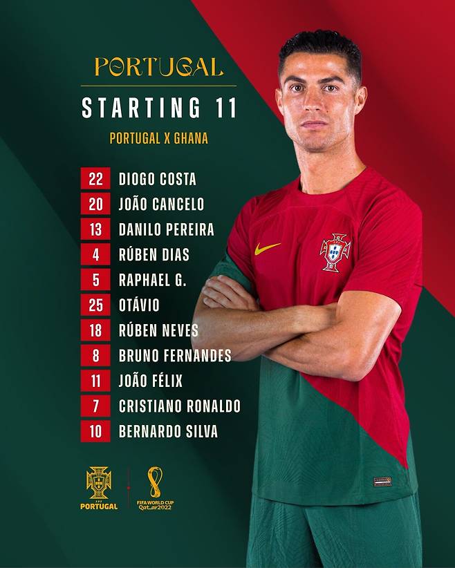 포르투갈은 25일(한국시간) 카타르 도하에 위치한 스타디움 974에서 열리는 가나와의 2022 FIFA(국제축구연맹) 카타르 월드컵 H조 1차전을 앞두고 선발 명단을 발표했다. 포르투갈은 가나와 우루과이 그리고 대한민국과 함께 H조에 편성됐다.