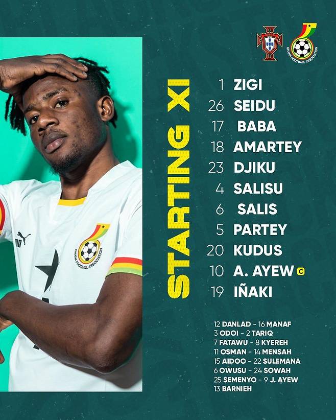 가나는 5-4-1로 맞서기로 했다. 로렌스 아티-지기가 골문을 지키고, 모하메드 살리수, 알렉산더 지쿠, 다니엘 아마티가 백3를 형성. 윙백 자리에는 압둘 라흐만 바바와 알리두 세이두가 출전한다. 중원은 안드레 아예우, 토마스 파티, 사리스 압둘 사메드, 모하메드 쿠드스가 출전했으며, 최전방 원톱 자리에서 이냐키 윌리엄스가 포르투갈 골문을 노린다.