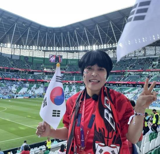 조혜련은 지난 24일 오후 24일(한국시간) 카타르 알라이얀의 에듀케이션 시티 스타디움에서 열린 한국과 우루과이의 카타르 월드컵 H조 1차전 현장을 직접 찾아 한국 국가대표팀을 향한 뜨거운 응원을 보냈다.
