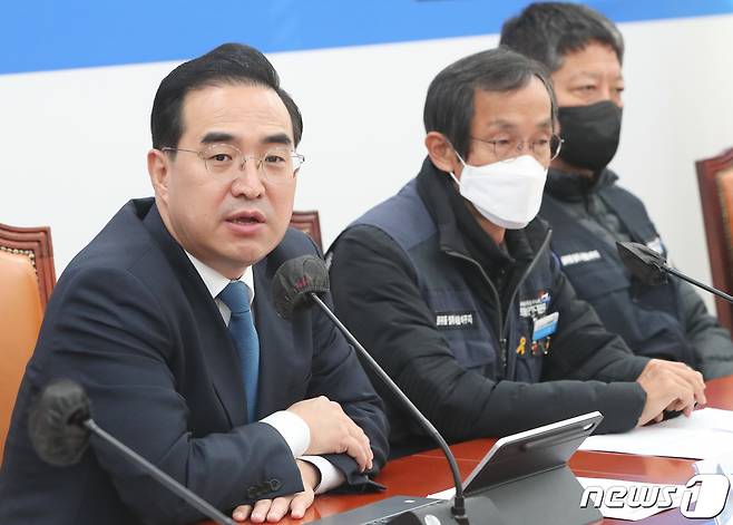 (서울=뉴스1) 허경 기자 = 박홍근 더불어민주당 원내대표가 25일 서울 여의도 국회에서 열린 화물연대본부 안전운임제 확대를 위한 간담회에서 모두 발언을 하고 있다. 2022.11.25/뉴스1