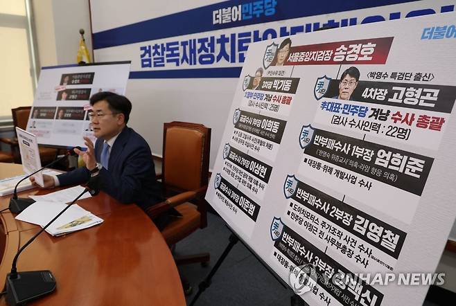 (서울=연합뉴스) 백승렬 기자 = 더불어민주당 검찰독재정치탄압대책위원회 공동위원장인 박찬대 최고위원이 25일 국회 대표실에서 열린 대장동 사업 구조 및 수익 배분 관련 기자간담회에서 발언하고 있다. 2022.11.25