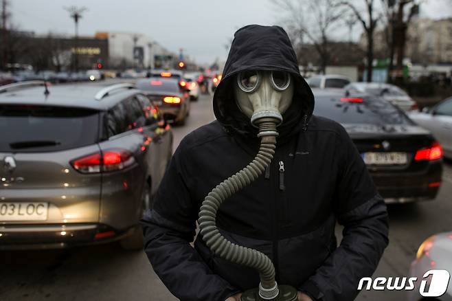 (로이터=뉴스1) 김예슬 기자 = 지난 2020년 2월14일(현지시간) 루마니아 부쿠레슈티에서 대기 오염에 항의하는 시위가 벌어졌다. 시위의 일환으로 한 기후 운동가가 차들 사이에서 방독면을 착용하고 있는 모습. 22.02.14