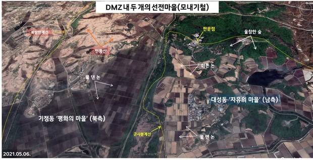 이 위성사진은 구글어스가 2020년 10월9일 포착한 남북 군사분계선(MDL) 주변 비무장지대(DMZ) 민간인통제구역(CCZ)에 위치한 두 선전마을을 담고 있다. 선전마을은 1953년 7월27일 유엔 군사정전협정 당시 합의에 따라 각 민통선 내 조성한 마을로 양측이 체제 우월성 등의 이유로 경쟁적으로 농사를 짓는 곳이다.