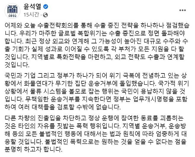 윤 대통령은 지난 24일 밤 본인 페이스북에 "국가적 위기 상황에서 물류 시스템을 볼모로 잡는 행위는 국민이 용납하지 않을 것"이라며 "지역별 운송거부, 운송방해 등의 모든 불법적인 행동에 대해서는 법과 원칙에 따라 엄중하게 대응할 것"이라고 밝혔다.