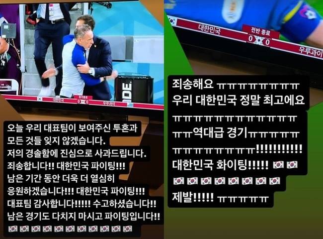 이런 가운데 딘딘은 24일 오후 인스타그램을 통해 "죄송해요. 우리 대한민국 정말 최고예요. 역대급 경기"라며 눈물 흘리는 이모티콘을 잔뜩 게재했다. 또 "오늘 우리 대표팀이 보여주신 투혼과 모든 것들 잊지 않겠습니다. 저의 경솔함에 진심으로 사과드립니다"라고 사과하며 한국 국가대표팀을 재차 응원했다.