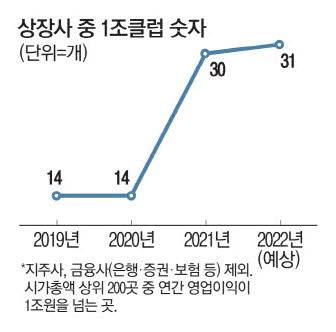 올해 1조클럽은 증권사 3곳 이상 추정치(에프앤가이드 기준)로 추렸으며 지주사와 은행·증권사 등 금융업종은 제외했다. 1조클럽은 2019년과 2020년 각각 14개였는데 2021년 30개, 올해 31개로 코로나를 통과하면서 오히려 2배 급증했다. 올해 1조클럽이 늘어날 것으로 예상되는 이유는 우량 기업들이 돈 되는 곳에 과감히 투자하는 한편 비용은 크게 절감했기 때문으로 분석된다.