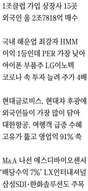투자자 입장에선 삼성전자처럼 항상 1조클럽에 가입돼 있는 터줏대감보다는 LG이노텍 같이 사상 처음 영업이익 1조원을 넘기는 새내기에 주목할 필요가 있다. 2020년 당시 흑자 기업 중에서 1조클럽이 아니었다가 올해 새로 가입이 예상되는 곳은 15곳이다. 외국인투자자들은 올 들어 11월 21일까지 이들 15개 기업 주식을 2조7818억원어치나 순매수했다. 같은 기간 외국인은 코스피와 코스닥 종목을 각각 6조7338억원, 4조3826억원 순매도했다. 1조클럽에 대한 편애가 그대로 드러난다.