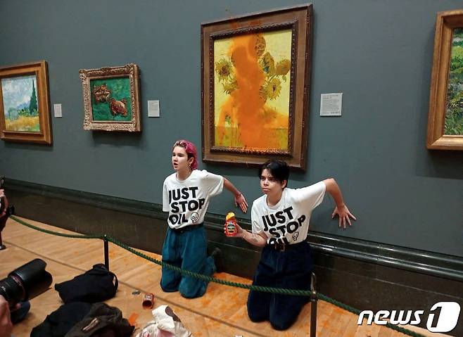 (런던 로이터=뉴스1) 김예슬 기자 = 지난달 10월14일(현지시간) 영국 런던의 내셔널 갤러리에서 열린 반 고흐 전시회 중 '해바라기'에 수프를 던진 환경운동가들. 22.10.14
