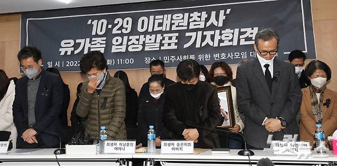 핼러윈 참사 유가족들이 22일 서울 서초구 민주사회를 위한 변호사모임 대회의실에서 열린 '10·29 핼러윈 참사 유가족 입장발표 기자회견' 시작에 앞서 희생자들을 위해 묵념하고 있다. 이날 유가족은 참사 이후 처음으로 언론 앞에서 정부의 진정성 있는 사과를 촉구했다. 류영주 기자