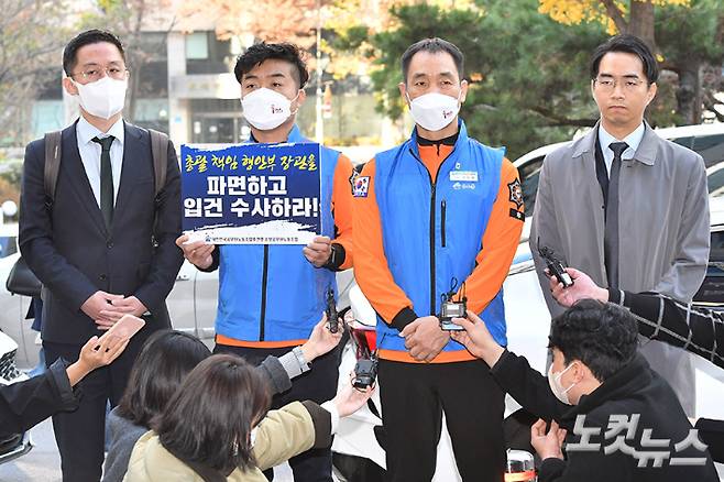고진영 소방노조 위원장이 23일 서울 마포구 경찰 특별수사본부(특수본)에 고발인 자격으로 출석하며 기자회견을 하고 있다. 소방노조는 지난 14일 핼러윈 참사 책임을 물어 이상민 행정안전부 장관을 고발했다. 류영주 기자