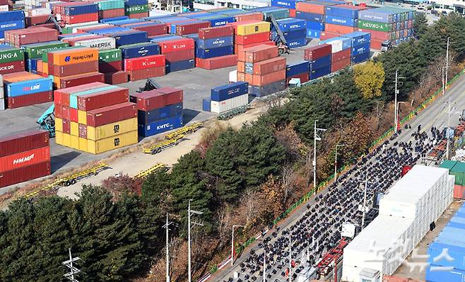 민주노총 공공운수노조 화물연대본부가 안전운임제 일몰제 폐지를 요구하며 무기한 총파업에 돌입한 24일 경기도 의왕시 내륙컨테이너기지(ICD) 입구에서 파업 출정식을 갖고 있다. 민주노총 공공운수노조 화물연대본부는 안전운임제 일몰제 폐지와 적용 차종·품목 확대 등을 요구하며 이날 0시부터 총파업에 돌입했다. 황진환 기자