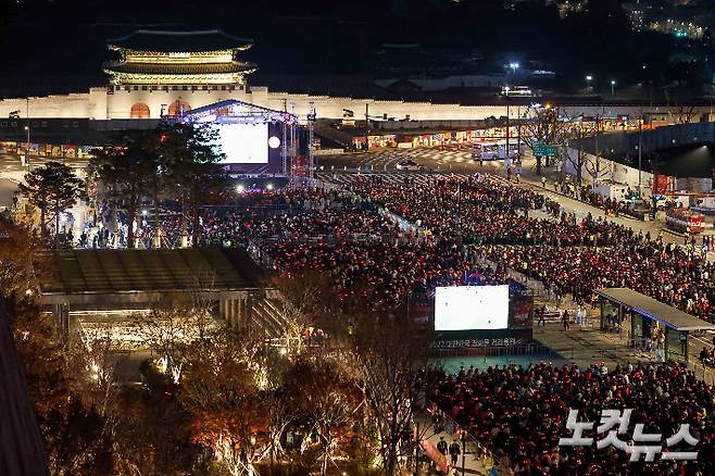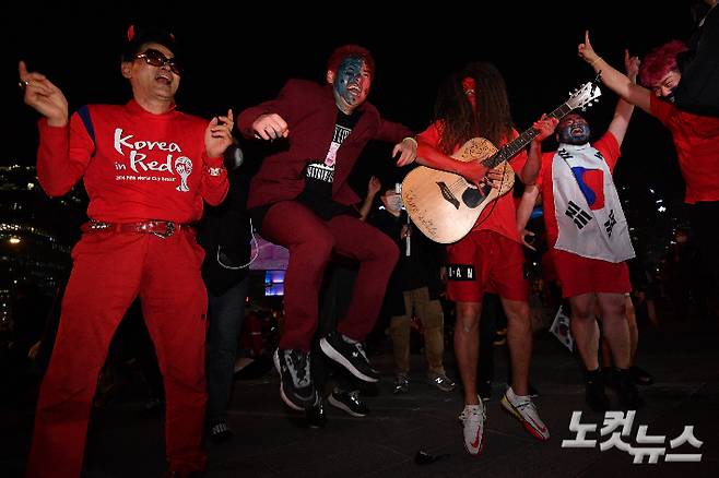 2022 카타르 월드컵 대한민국과 우루과이 경기가 진행되고 있는 24일 서울 종로구 광화문 광장에 모인 시민들이 열띤 응원을 펼치고 있다. 이날 광화문광장에는 주최 측 추산 2만6천여명의 응원단이 모여 열띤 응원전을 펼쳤다. 류영주 기자