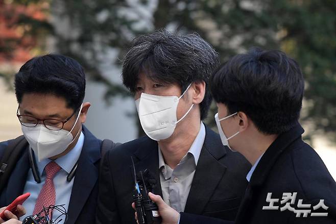 남욱 변호사가 21일 서울 서초구 서울중앙지방법원에서 열린 대장동 개발 배임 혐의 관련 공판에 출석하고 있다. 이날 남 변호사는 재판에 출석해 천화동인 1호 지분과 관련해 "이재명 지분이라는 걸 김만배에게 들었다"고 밝혔다. 박종민 기자