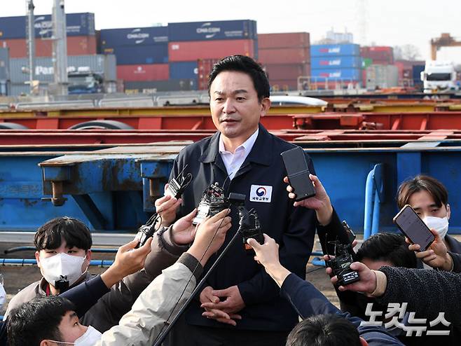 원희룡 국토교통부 장관이 화물연대본부 총파업 첫 날인 24일 경기도 의왕시 내륙컨테이너기지(ICD)에서 긴급 현장상황회의 후 취재진의 질문에 답하고 있다. 원 장관은 "운송거부가 계속되면 국민이 부여한 의무이자 권한인 업무개시명령을 국무회의에 상정할 것"이라고 재차 밝혔다. 의왕=황진환 기자