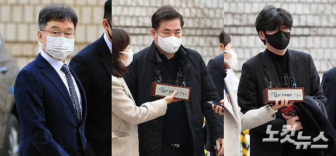 화천대유자산관리 대주주 김만배 씨(왼쪽부터), 유동규 전 성남도시개발공사 기획본부장, 남욱 변호사가 25일 서울 서초구 서울중앙지법에서 열린 대장동 개발 사업 로비·특혜 의혹 관련 1심 속행 공판에 출석하고 있다. 황진환 기자