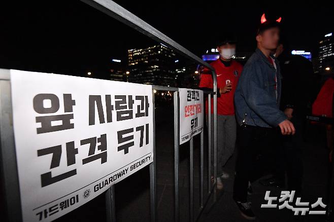 2022 카타르월드컵 대한민국과 우루과이 경기를 앞둔 24일 서울 종로구 광화문광장에 안전거리 유지 관련 안내문이 붙어 있다. 이날 경찰과 안전관리요원들은 통행로 확보에 주력했다. 류영주 기자