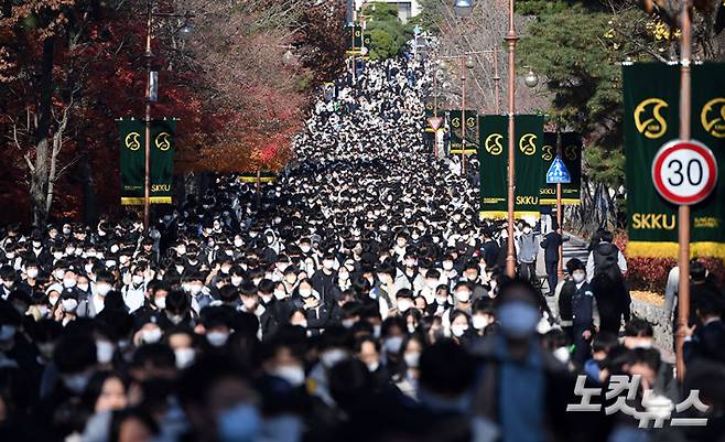20일 서울 종로구 성균관대학교에서 2023학년도 수시모집 논술시험을 마친 수험생들이 캠퍼스를 떠나고 있다. 입시업계에서는 수능이 문이과 통합형으로 바뀌면서 가채점으로 본인의 백분위를 예측하기가 더 어려워지는 등 복합적인 요인 때문에 올해 대학별고사 응시율이 예년보다 높아질 것으로 보고 있다. 황진환 기자