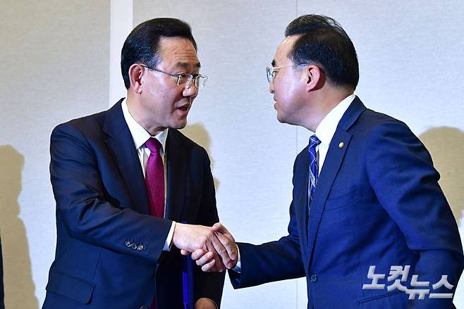 국민의힘 주호영 원내대표와 더불어민주당 박홍근 원내대표가 23일 서울 여의도 국회에서 이태원 참사 국정조사 실시와 관련 합의 발표 후 악수하고 있다. 조사 대상에는 대통령실 일부가 포함됐고, 실제 조사는 내년도 예산안을 처리한 이후에 진행하기로 했다. 윤창원 기자
