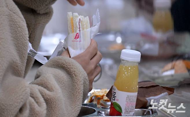 학교비정규직노동자들이 정규직과 임금 차별 해소 등을 요구하며 총파업에 돌입한 가운데 25일 서울시 성동구의 한 중학교에서 학생들이 급식 대신 샌드위치와 머핀 등 대체급식으로 점심을 해결하고 있다. 사진공동취재단