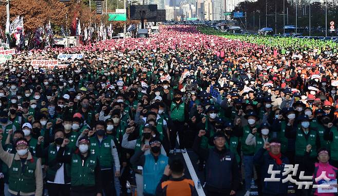 25일 서울 여의도공원 인근에서 열린 민주노총 공공부문 비정규직 총파업대회에서 참석자들이 실질임금 삭감대책 마련, 복지수당차별 완전철폐, 직무성과급제 저지 등을 촉구하고 있다. 류영주 기자