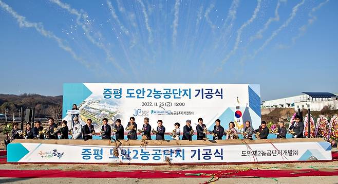 [증평=뉴시스] 강신욱 기자 = 25일 오후 충북 증평군 도안면 광덕리에서 열린 도안2농공단지 기공식에서 참석자들이 시삽하고 있다. (사진=증평군 제공) 2022.11.25. photo@newsis.com