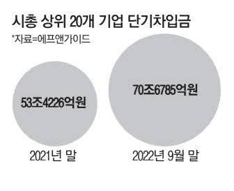 25일 기업 재무분석기관 에프앤가이드에 따르면 국내 시가총액 상위 20개 기업의 단기차입금 잔액 총액은 올해 들어 17조2559억원(32.3%) 늘어난 70조6785억원으로 집계됐다.