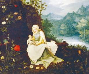 전경의 두 모자(母子)는 선명하게, 원경의 풍경은 옅게 그리는 식으로 대비를 이뤘다. 성모 마리아와 아기 예수를 둘러싸고 있는 꽃과 수풀은 그가 ‘꽃 브뤼헐’로 불리는 아버지를 닮아 꽃 정물화에 능했다는 것을 보여준다.