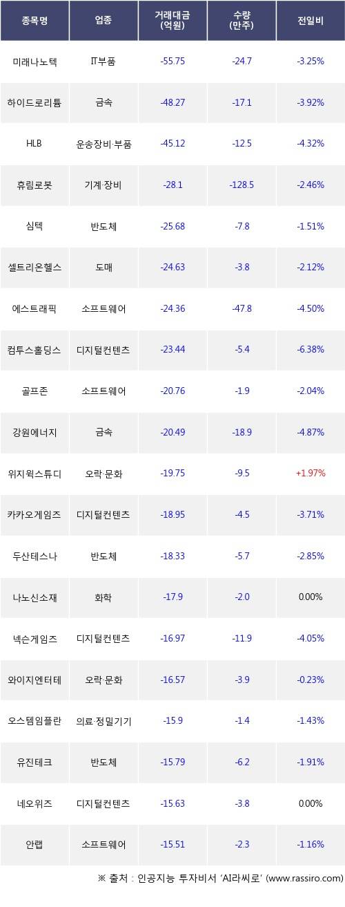 외국인 투자자의 순매도 상위 20개 종목은 미래나노텍, 하이드로리튬, HLB, 휴림로봇, 심텍, 셀트리온헬스케어, 에스트래픽, 컴투스홀딩스, 골프존, 강원에너지등이다.