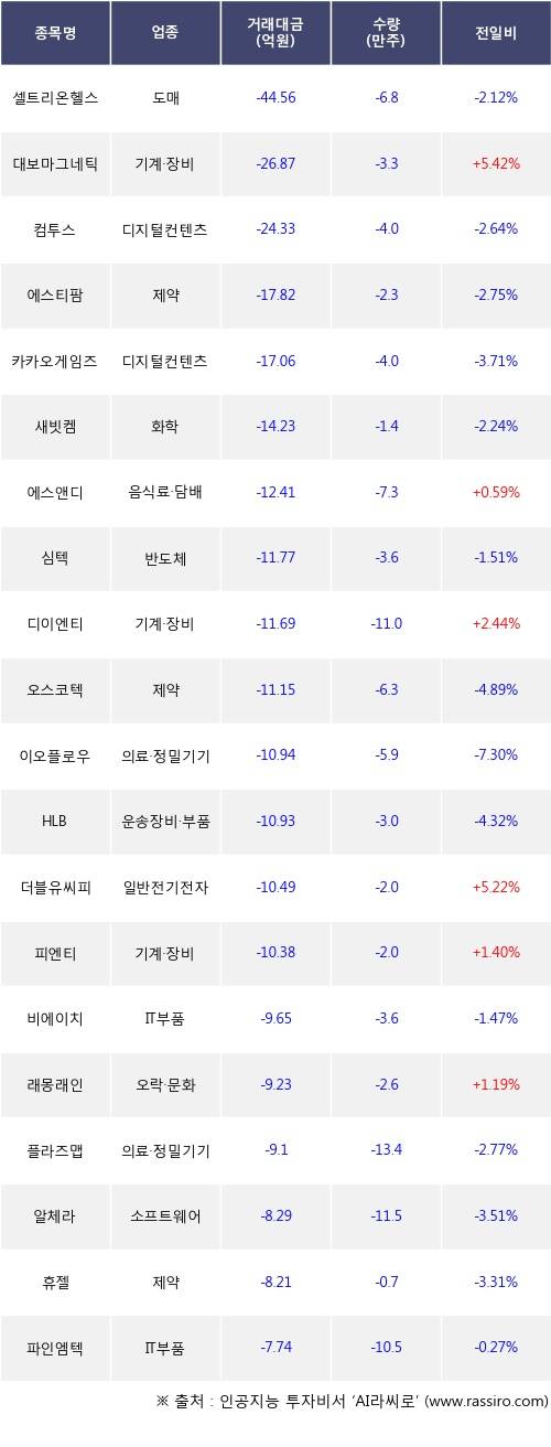 기관 투자자의 순매도 상위 20개 종목은 셀트리온헬스케어, 대보마그네틱, 컴투스, 에스티팜, 카카오게임즈, 새빗켐, 에스앤디, 심텍, 디이엔티, 오스코텍등이다.