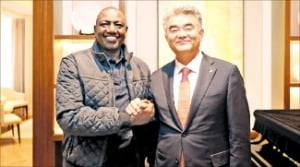정원주 중흥그룹 부회장(오른쪽)이 25일 서울 소공동 롯데호텔에서 윌리엄 루토 케냐 대통령(왼쪽)을 만나 원자력 발전과 신재생에너지, 인프라 개발사업 등을 논의했다.