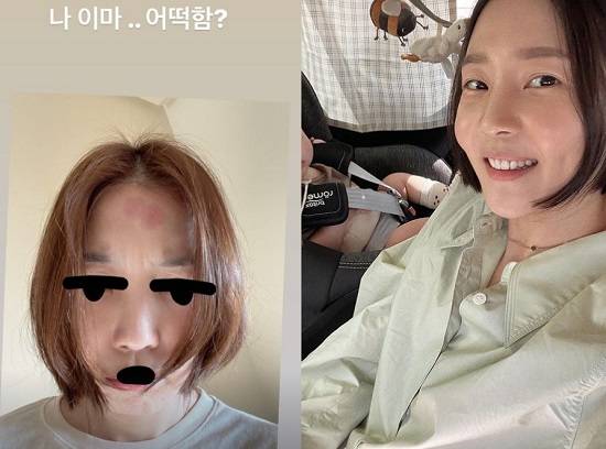 공개된 사진 속 신다은은 이마에 붉은 자국이 남은 모습이다.