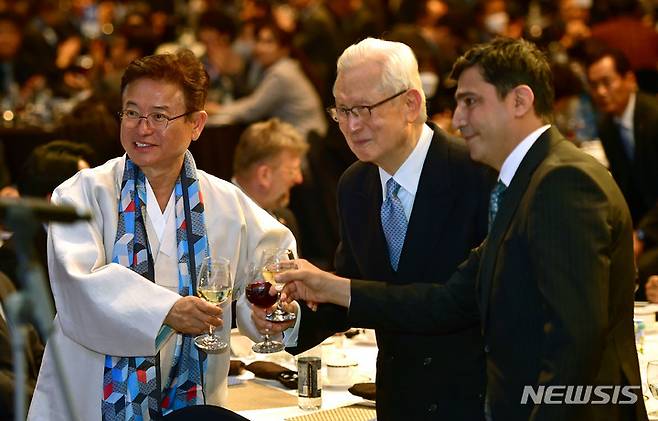 [대구=뉴시스] 이무열 기자 = 이철우 경북도지사(왼쪽)와 신일희 계명대 총장(공동의장), 바시프 알리에쁘 주한 아제르바이잔 참사관이 25일 오후 대구 수성구 만촌동 호텔인터불고 컨벤션홀에서 열린 '2022 DGIEA 친선의 밤' 행사에서 건배하고 있다. 2022.11.25. lmy@newsis.com