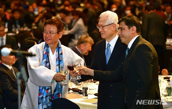 [대구=뉴시스] 이무열 기자 = 이철우 경북도지사(왼쪽)와 신일희 계명대 총장(공동의장), 바시프 알리에쁘 주한 아제르바이잔 참사관이 25일 오후 대구 수성구 만촌동 호텔인터불고 컨벤션홀에서 열린 '2022 DGIEA 친선의 밤' 행사에서 건배하고 있다. 2022.11.25. lmy@newsis.com