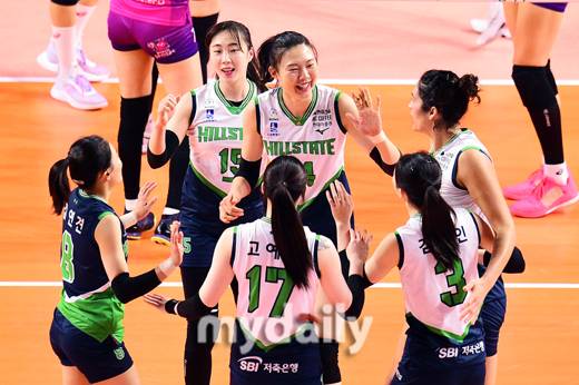 [마이데일리 = 인천 곽경훈 기자] 현대건설이 25일 오후 인천 삼산월드체육관에서 진행된 '도드람 2022-2023 V-리그' 흥국생명-현대건설의 경기에서 승리한 뒤 하이파이브를 하고 있다.- ⓒ마이데일리(www.mydaily.co.kr). 무단전재&재배포 금지 -