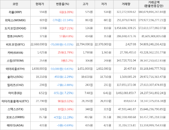 한편 거래금액 기준으로는 리플, 위믹스, 도지코인 순으로 가장 활발한 거래를 보이고 있다.