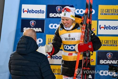 epa10327507 Emma Ribom of Sweden celebrates on the podium after winning the women's classic sprint final at the FIS Cross Country World Cup in Ruka, Finland, 25 November 2022. EPA/KIMMO BRANDT