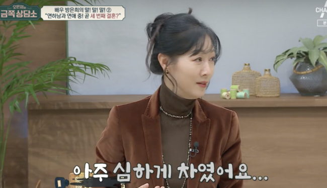 '오은영의 금쪽 상담소'에서 방은희가 출연한 가운데 두 번 다 한 달만여 이혼과 결혼이 번복된 과거를 고백한 가운데 최근 연하남을 만난 근황을 깜짝 고백했다.
