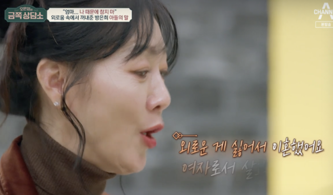 이 후 두번째 이혼을 결심한 이유에 대해 방은희는 “같이 식탁에서 밥얼 믁는데 너무 외롭더라, 혼자 밥 먹는 것보다 더 큰 외로움”이라며 “아들 중학생일 때 이혼에 대해 물으니 ‘엄마, 나 때문에 참지마’라고 하더라”며 “외로운게 싫어서,여자로서 살고 싶어 이혼했다, 그래서 지금이 더 좋다고 생각한다”고 밝혀 눈길을 끌었다.