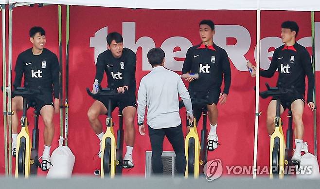 (도하=연합뉴스) 임헌정 기자 = 2022 카타르 월드컵 우루과이와의 조별예선 첫 경기를 마친 대한민국 대표팀 선수들이 25일(현지시간) 카타르 도하 알에글라 훈련장에서 회복훈련을 하고 있다.