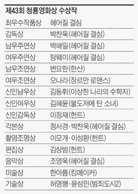 ‘헤어질 결심’, 작품상 등 청룡 6관왕... 박해일·탕웨이 남녀 주연상