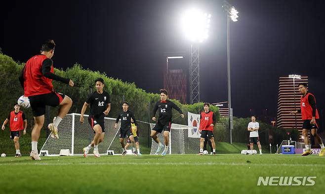[도하(카타르)=뉴시스] 조성우 기자 = 대한민국 축구대표팀 선수들이 25일(현지시간) 오후 카타르 도하 알 에글라 트레이닝센터에서 훈련을 하고 있다. 2022.11.25. xconfind@newsis.com