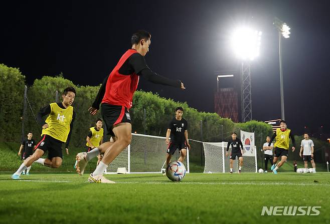 [도하(카타르)=뉴시스] 조성우 기자 = 대한민국 축구대표팀 선수들이 25일(현지시간) 오후 카타르 도하 알 에글라 트레이닝센터에서 훈련을 하고 있다. 2022.11.25. xconfind@newsis.com