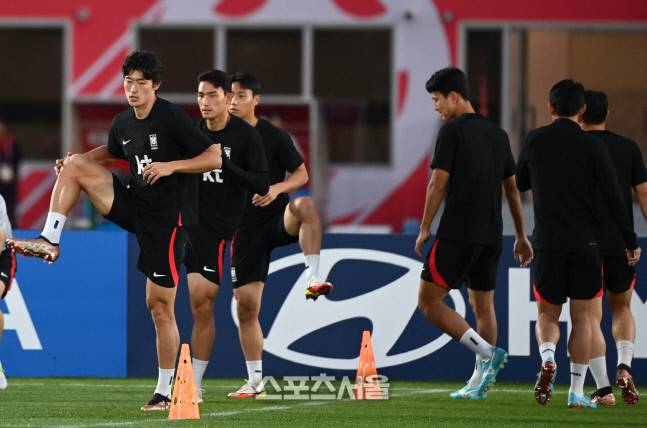 축구대표팀 조규성이 25일 카타르 도하 에글라 트레이닝센터에서 훈련을 하고 있다.