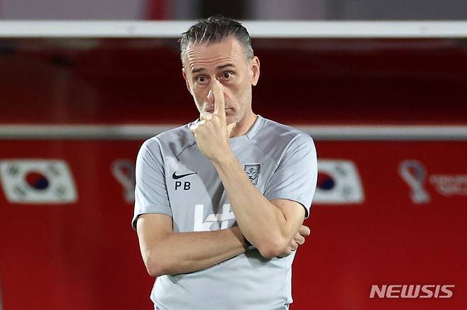 [도하(카타르)=뉴시스] 조성우 기자 = 대한민국 축구대표팀 벤투 감독이 25일(현지시간) 오후 카타르 도하 알 에글라 트레이닝센터에서 선수들 훈련을 지켜보고 있다. 2022.11.25. xconfind@newsis.com