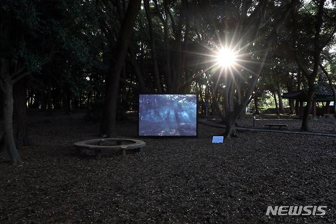 [제주=뉴시스] 박진희 기자 = 제3회 제주비엔날레가 열리고 있는 25일 제주시 삼성혈 위성 전시관에 박지혜 작가의 영상 '세 개의 문과 하나의 거울' 전시되고 있다. '세 개의 문과 하나의 거울'은 제주만의 독특한 신화적 모티브에서 출발한 영상 작업이다. 작가는 삼성혈(三姓穴)이라는 탐라국 전설이 내려오는 장소를 현실의 공간과 교차시켜 생기는 모호한 경계를 영화적 이미지를 통해 이야기하고자 한다. 제주의 신화적 시공간에 살고 있는 제주도민과 관광 및 다른 목적으로 방문하는 타지인들이 서로 공감하고 공유할 수 있는 새로운 관계의 시공간을 발생시키고자 한다. 2022.11.25 pak7130@newsis.com