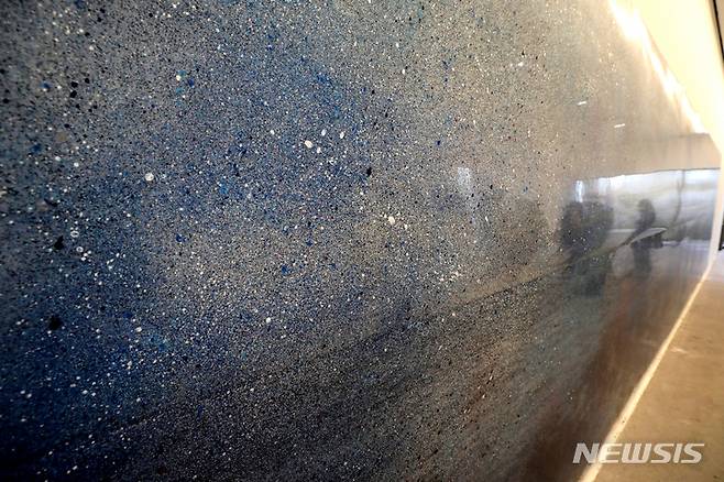 [제주=뉴시스] 박진희 기자 = 제3회 제주비엔날레가 열리고 있는 25일 제주 위성 전시관인 가파도 AiR(가파도 아티스트 인 레지던스)에 윤향로 작가의 작품 'Moon River'가 전시되어 있다. 'Moon River'는 대중문화에서 표현되는 우주 이미지를 참조하여 회화로 만든 것이다. 상실로 시간이 멈춘 듯한 감정과 흐르는 시간을 붙잡고 싶은 모순된 마음을 함께 담았다. 바닥부터 벽면까지 연결된 작품은 우주 속에서 우주를 바라보는 위압감과 몽환을 선사한다. 2022.11.25 pak7130@newsis.com