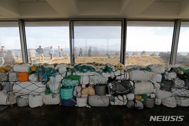 [제주=뉴시스] 박진희 기자 = 제3회 제주비엔날레가 열리고 있는 25일 제주 가파도 위성 전시관에 홍이연숙 작가의 '가파도에 온 것들' 작품이 전시되어 있다. '가파도로 온 것들'은 글라스하우스 전시장을 투명하고 커다란 해양쓰레기를 담는 통으로 삼아, 가파도 해안에 떠밀려온 쓰레기들로 채우고, 다양한 가오리 깃발을 설치했다. 또한 작가는 쓰레기 아래로 내려가 바닷속 생물에게 사바하를 불러주는 퍼포먼스도 진행하는데, 이는 바다의 생명을 위로하고 그들이 본연의 삶을 이어나가며 인간과 함께하기를 소망하는 자연 공생의 의미를 담고 있다. 2022.11.25 pak7130@newsis.com