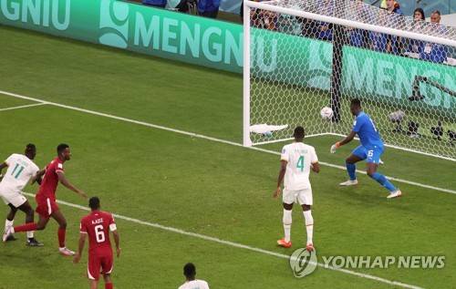 epa10327660 Mohammed Muntari of Qatar (2L) scores the 2-1 during the FIFA World Cup 2022 group A soccer match between Qatar and Senegal at Al Thumama Stadium in Doha, Qatar, 25 November 2022. EPA/Mohamed Messara