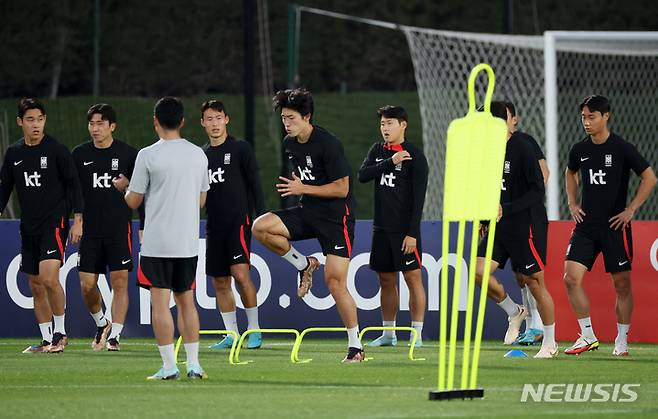 [도하(카타르)=뉴시스] 조성우 기자 = 대한민국 축구대표팀 선수들이 25일(현지시간) 오후 카타르 도하 알 에글라 트레이닝센터에서 훈련하고 있다. 2022.11.25. xconfind@newsis.com