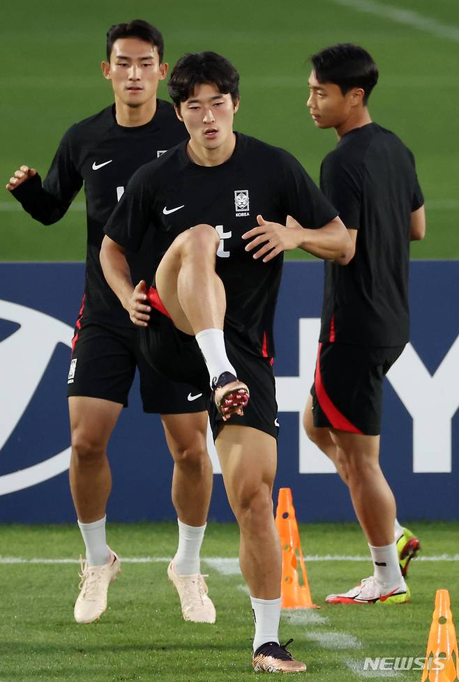 [도하(카타르)=뉴시스] 조성우 기자 = 대한민국 축구대표팀 조규성이 25일(현지시간) 오후 카타르 도하 알 에글라 트레이닝센터에서 훈련하고 있다. 2022.11.25. xconfind@newsis.com